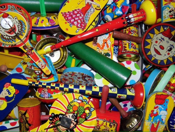 As I got older and attended parties on the last day in December there were cute metal noisemakers, decorated with clowns or pretty girls. Twisting and twirling, they rang in the new year.