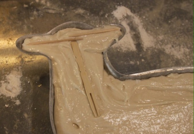 Now comes the part to keep the lambs head from rolling off, which is never a pretty site. Place one toothpick in each ear and a thick bamboo skewer in the neck. The skewer should be placed about 1 inch in from the top of the head and extend into the body. Poke these down slightly into the cake batter and make sure they are covered with batter.