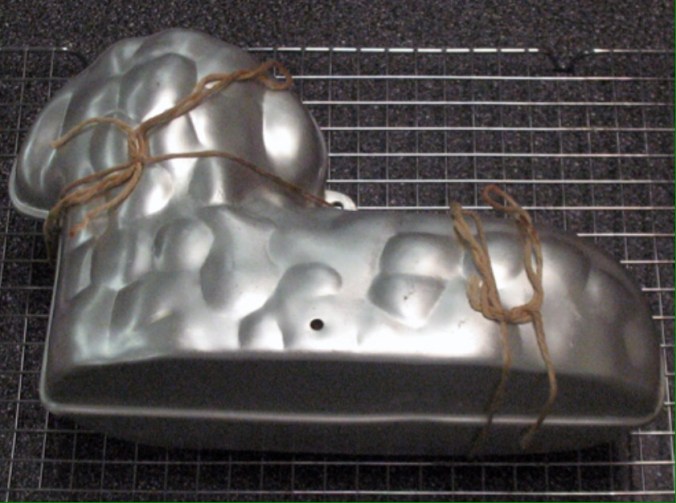 Now place the other half of the mold in place and then tie it shut securely with bakers twine. This allows the cake to rise securely into the second half.