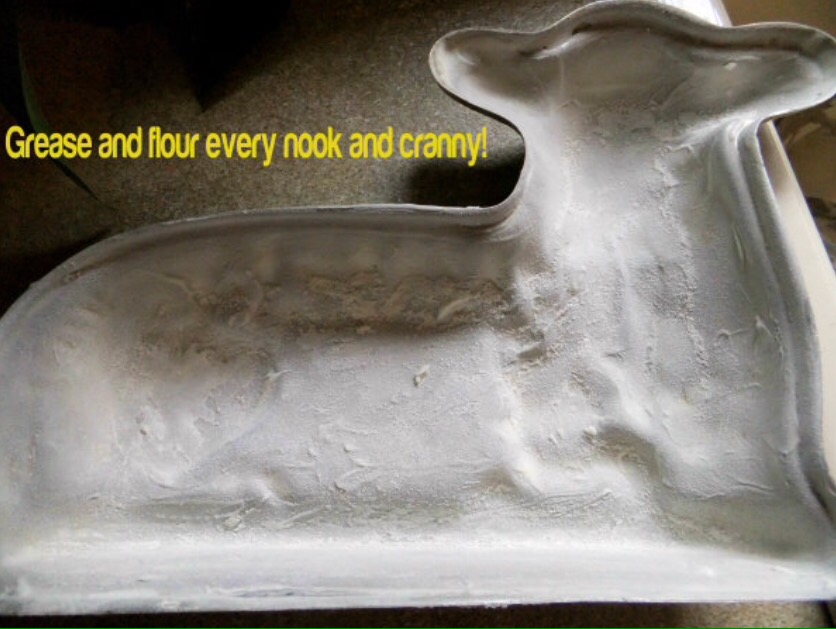 First, coat the interior with shortening. Be sure you get in EVERY little nook and cranny. If you don’t you could have a disastrous crumbling lambie on your hands. Then dust with flour. Same thing. Every nook. Every cranny.